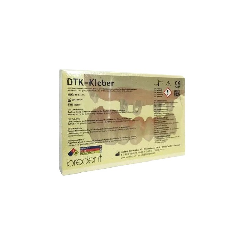 984 035 410El adhesivo de curado dual DTK-Adhesivo consigue una unión duradera y segura entre todos los materiales protésicos. Resulta óptimo para aditamentos personalizados unidos mediante adhesión Ahora también permite la esterilización. Ventajas : • Higiene gracias a permitir la esterilización • Adhesión limpia mediante el sellador FGP-Isolierung • Permite la aplicación tanto intra como extraoral Adhesión de todos los materiales protésicos: Para cerámica (e.max®) aplicar K-Primer Para circonio/ metal no noble / titanio aplicar MKZ Primer Para aleaciones de metales nobles aplicar MKZ Primer + MKZ EM-Aktivator Para BioHPP/ PEEK aplicar visio.link