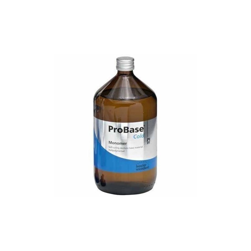 Probase Cold Monómero es el componente líquido del sistema Probase Cold, desarrollado por Ivoclar para la elaboración de bases de prótesis dentales mediante la técnica de vertido y empaquetado. Su formulación optimizada permite una mezcla homogénea con el polímero en polvo, asegurando una polimerización controlada y una excelente estabilidad dimensional. Además, es compatible con otros materiales de Ivoclar, lo que facilita correcciones y reparaciones sin comprometer la calidad del material.